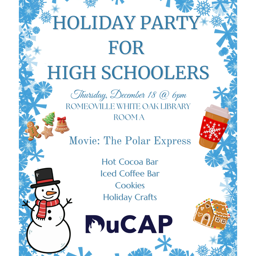 DuCAP is hosting a free holiday party for highschoolers to celebrate the end of finales! Come join us at Romeoville White Oak Library to watch Polar Express, and have fun doing holiday crafts, and enjoy some nice snacks and refreshments! RSVP HERE.